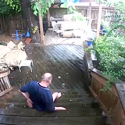 A woman slips and falls down a flight of stairs on a front balcony. Security footage.