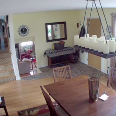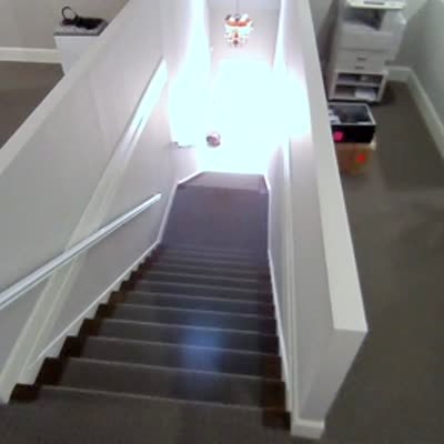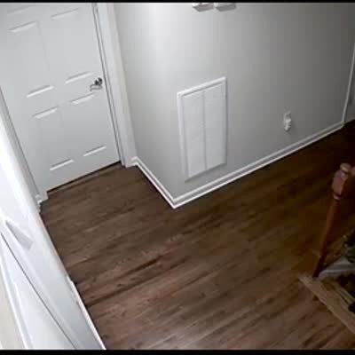 A man slips and falls down a flight of stairs in a house. Home security footage.