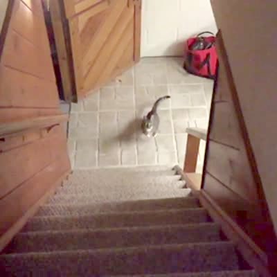 A cat climbs upside down on a flight of carpeted stairs at home and briefly stops to hang from the stairs as music plays over the clip. TikTok video.
