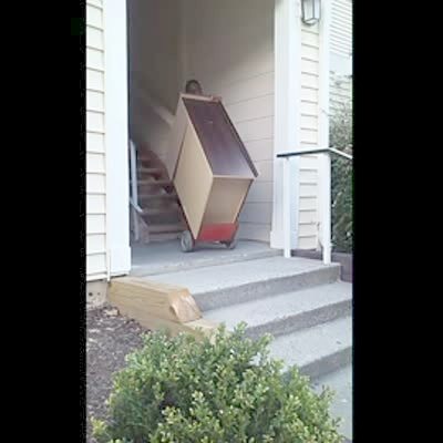 A man carries a dresser down a flight of stairs on a dolly. The dolly goes over a bump and the dresser falls apart.