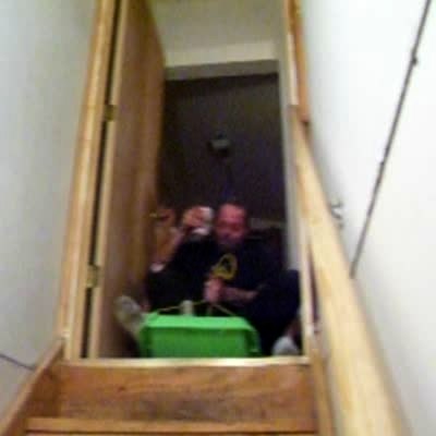 A young man walks up a flight of stairs to his house and drops a drink, but he catches it before it spills. He sets it down and adjusts pillows on a chair, then knocks it over with the pillow and spills it. Security footage.