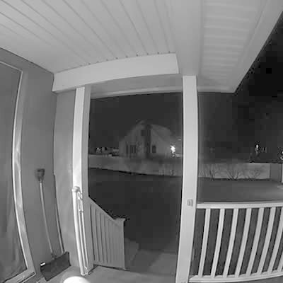 A young woman runs up a flight of porch stairs and trips and falls, then says that she needs to pee. Security footage.