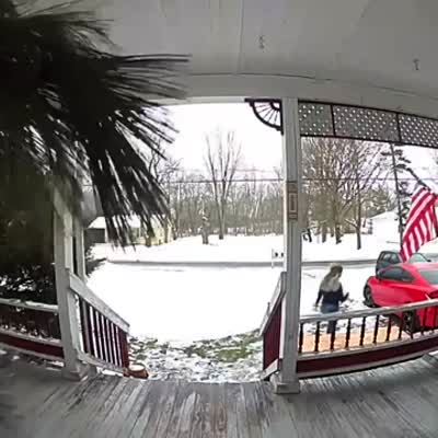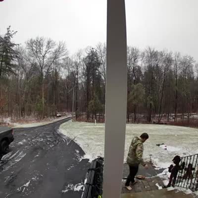 A young man slips on ice and slides down a flight of porch stairs on his butt, losing a shoe. Security footage.