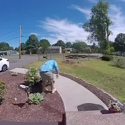 A man tries to carry a heavy cooler up a flight of porch stairs, but he loses his balance and falls off the steps. A man comes out of the house and asks"Where'd he go?" Security footage.