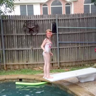 A girl says that she is the "world's best flipper" while standing on a diving board outdoors, then falls into the pool.