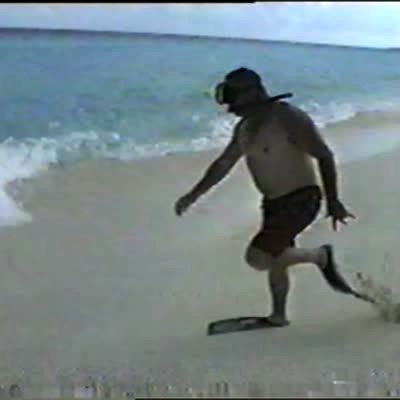 Man belly flops into the shallow ocean with flippers & snorkel gear on. Bad dive into water. BAD TRACKING. Summer, vacation, beach.