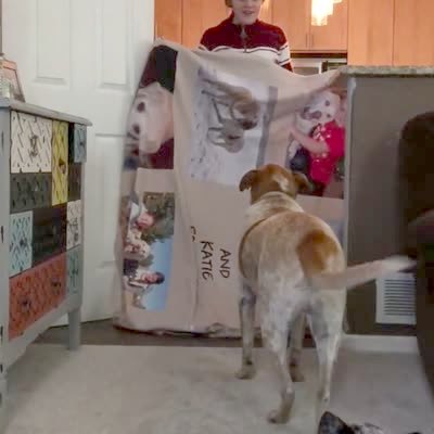 A woman does the what the fluff challenge for her dogs in the living room and she drops the blanket on one of the dogs and it runs around confused.