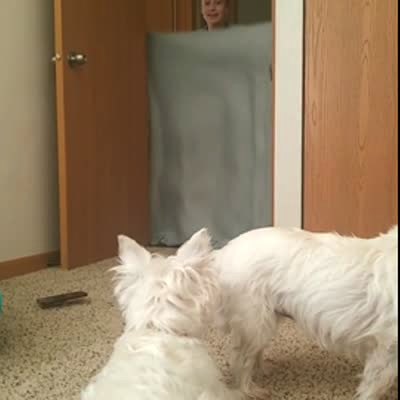 A woman does the what the fluff challenge for her dogs in the hallway, and after she throws the blanket up, one of the dogs jumps up and grabs it. She runs into the bedroom and the two dogs walk around until they find her.