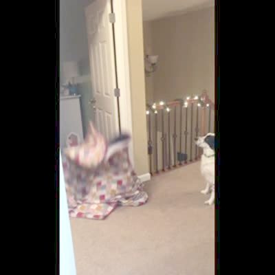 A woman stands at the bottom of the stairs and does the what the fluff challenge for her dog and it runs down the stairs to find her. A young girl does it next, but the dog doesn't pay attention. Then a tot boy goes, but drops the blanket on a second dog and then runs away.