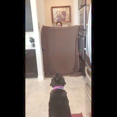 A Labrador dog runs around the hallway and looks inside rooms for a woman after she runs when she drops a blanket for the What the Fluff challenge.