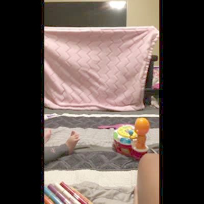 A young girl tosses a blanket into the air and when she "disappears" it looks like she turns into her baby sister.