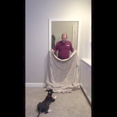 A man does the what the fluff magic trick for his dog who doesn't seem to care that the man is gone.