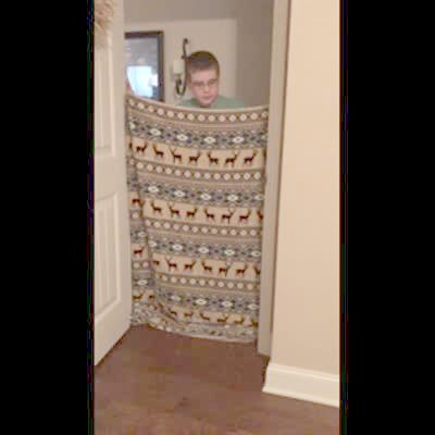 A young girl appears to transform in to her father when he walks through the garage door and in to the living room as she hides after she drops the blanket she uses for the What the Fluff Challenge in the room between the living room and the garage.