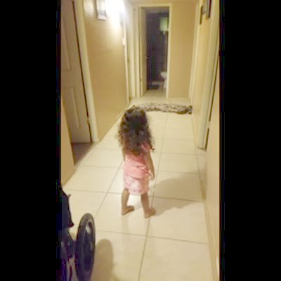 A young girl is clearly visible while she runs down the hallway after she does the what the fluff challenge for her young brother and father.