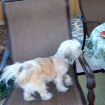 "Doggy-Go-Round" Small fluffy dog spins in circles in a patio chair while she tries to get food off the table. Outdoors.