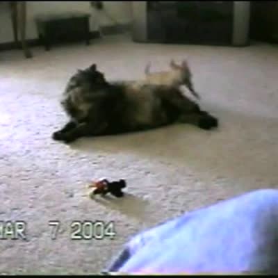 Fluffy, hairy gray dog barks & bounces in front of his bone on the floor. Dog looks like it's head banging.
