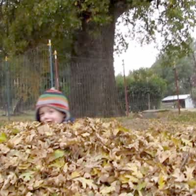 A boy tot jumps into a pile of leaves and his parents applaud him. The boy points and yells and is then tackled by a dog who wants to join the fun. The tot cries, but the parents are amused.
