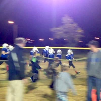A Peewee football team runs through a banner before their game. One boy runs around to the wrong side and collides/ crashes into the first boy through the banner.