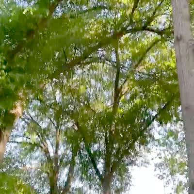 A woman screams while she hangs upside down from a zip-line and rides above the tops of the trees.