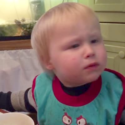 "Magic Trick Tot" A woman tells a tot boy to put a piece of paper in her fist in a kitchen. She shakes her hand and throws the paper over her shoulder, then laughs with the tot boy and shows him that it is gone. After a few rounds of this trick, the tot boy yells "oh my gosh."