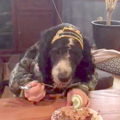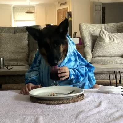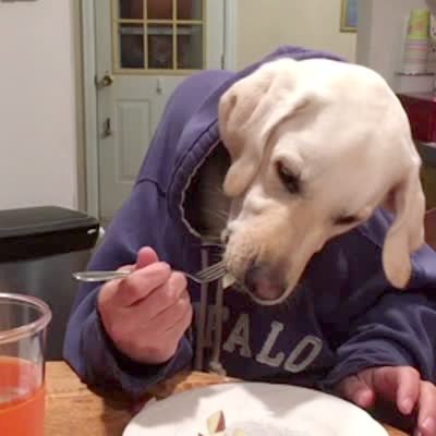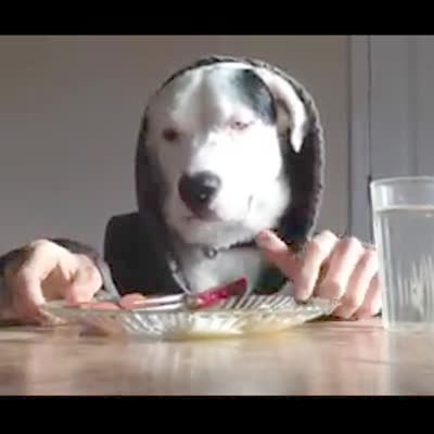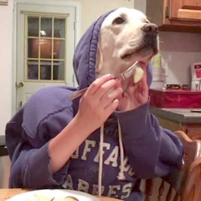 A dog with borrowed hands sits at the dining table in the living room and uses utensils to eat food off a plate.