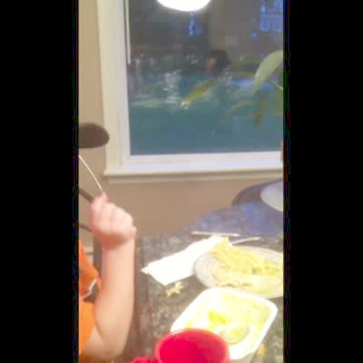 A boy puts a fork between his hat and his head. He dips his head down to a plate of noodles at a dining room table, picks up a noodle with his fork. He lifts his head back up and the noodle falls in his mouth. Short tails. Tricks.