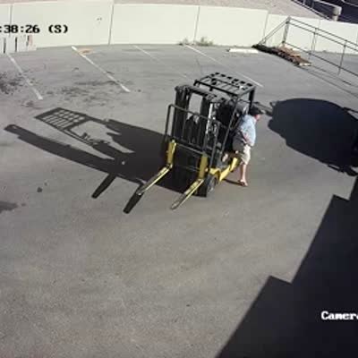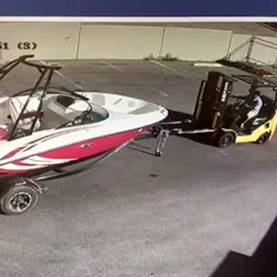 A man uses a forklift to move a boat across a parking lot, but the boat slips from the fork and rolls down the hill. The man gets out of the forklift and runs to stop the boat, but forgets to turn on the brakes for the forklift, so it rolls down the hill as well and hits the boat. The boat turns and goes farther down the hill and hits a fence. The man runs to get the boat and the forklift comes back down the hill and hits the boat again. Submitter contacted to re-submit