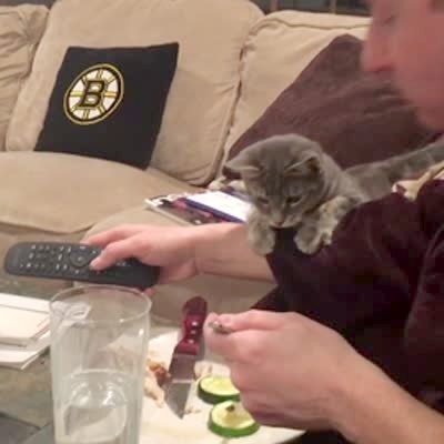 A cat watches a man eat. The cat takes chicken off the man's fork and runs away.