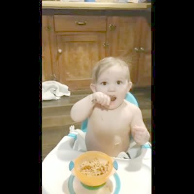 A man films twin baby siblings who eat pasta. The baby girl is all clean and eats her pasta with a fork but the baby boy has a mess everywhere and is eating the food straight from the bowl.