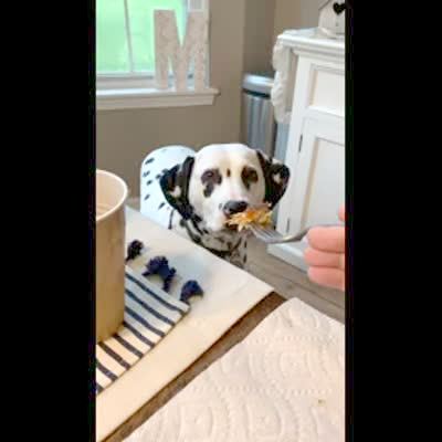 A man tries to feed a Dalmatian dog food from a fork, but twice a Dachshund dog jumps up and steals it.