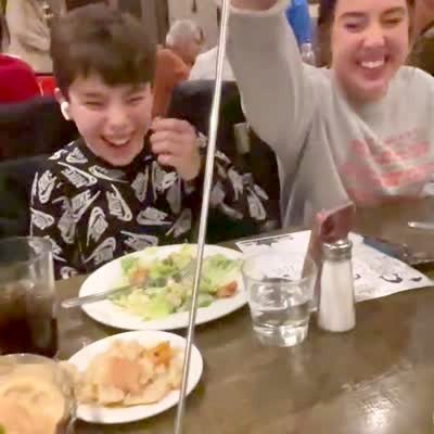 A teen girl takes out an extender fork at a restaurant and grabs some of her mother's salad across the table, then she and her young boy brother laugh as she feeds him with it. Featured talent cleared only (the girl with the fork, her brother, and the other people at their table).