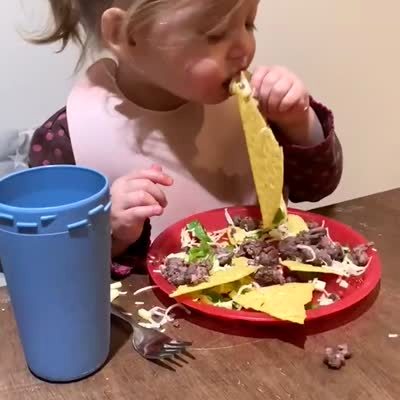 A tot girl eats a hard-shelled taco in a kitchen before the entire thing falls to her plate.