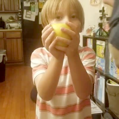 A young boy holds an apple and pretends it levitates for a magic trick in the kitchen, then the apple moves to reveal it's attached to a fork the boy holds in his mouth.