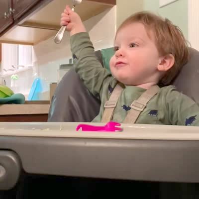 A tot boy asks his mom where his fork went, but he is holding it in his hand at the kitchen table.