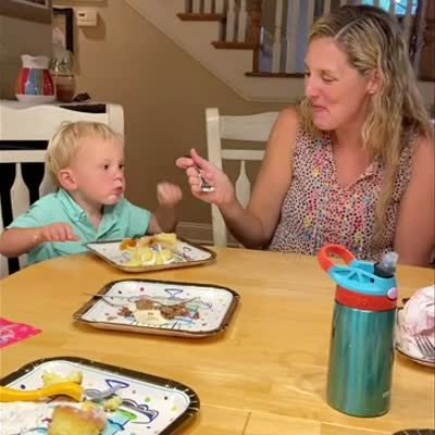 A tot boy in a dining-room takes a woman's plate and fork and eats her cake. She takes another plate and the boy takes that one too. They continue to trade plates.