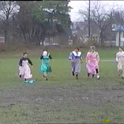 Dressed to Play. Girls in dresses play football (actually rugby) on muddy field.