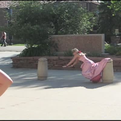Teen girl wearing long pink prom dress leapfrogs over cement barricades on campus, dress gets caught on one, girl falls down.