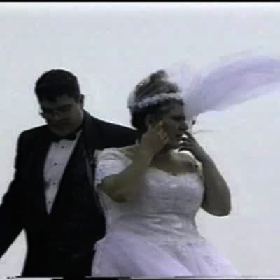 "The Bride And The Bee" Bride with bee in her veil whacks it away, hits groom in groin