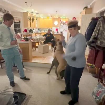 A senior woman is knocked over by two dogs as she tries out a virtual reality boxing game in a living room.