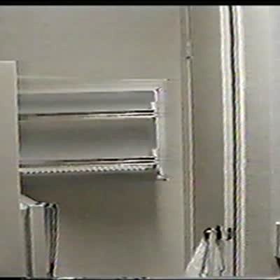 A man tries to move a freezer through a door, then the strap breaks and he falls backwards. Security camera footage.