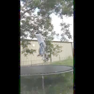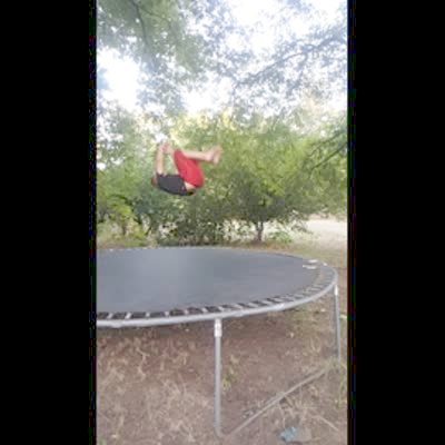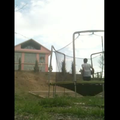 A boy does a back flip on a trampoline in the yard and then does a front flip but falls forward and hits his face on the edge of the trampoline where the springs are.