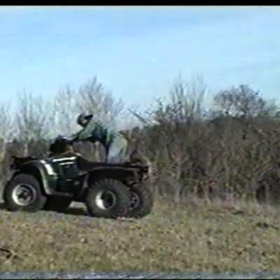 Man rides 4-wheel ATV on his knees, flips it up, & man is thrown over the front of it when it lands. Bonehead. Outdoors. *short tail/ bad tracking