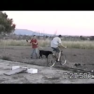 Teen boy jumps on a bike, another throws a stick through the spokes of the front tire causing the bike to flip over