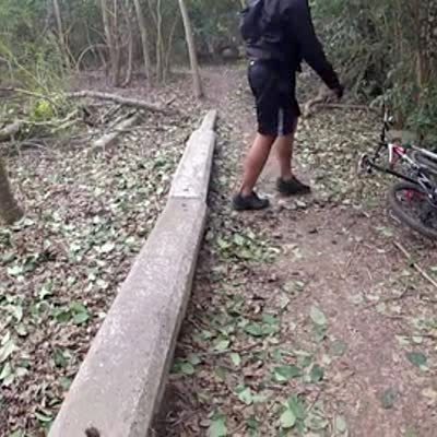 A man flips over the front of his bike while trying to ride on a narrow concrete slab in the woods.