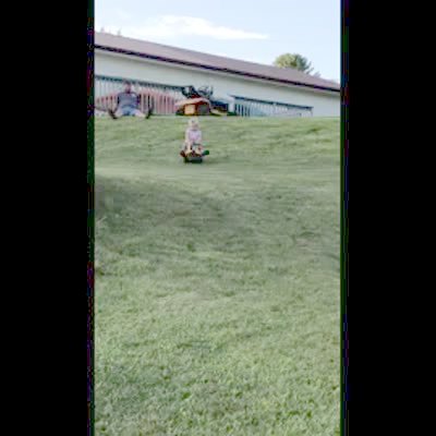 A man uses a ride-on lawn mower up a steep hill in a front yard, and it flips over. Security footage.
