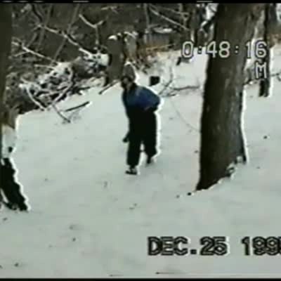 Man & young boy try to ride an old fashioned kick sled (which had blades on the bottom). Man flips over the front of the sled and lands on his son. Winter.