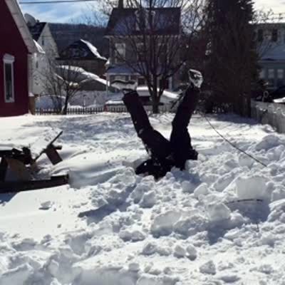 A man goes to do a front flip off of a table outdoors. The table breaks and he lands head first in the snow.