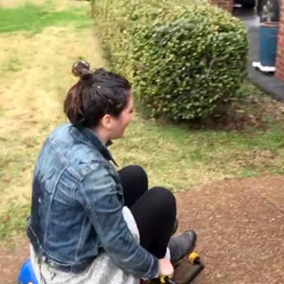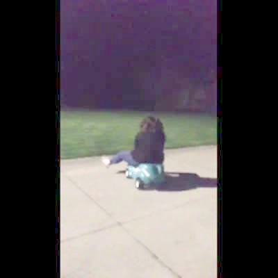 A teen girl rides a toy car down a driveway and flips over the front and falls down when she hits the grass.