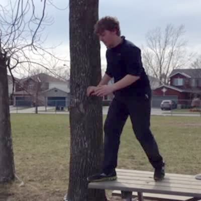 A young boy climbs onto a handrail in a park, does a backflip off of it, but hits his head hard on that same rail on the way down.