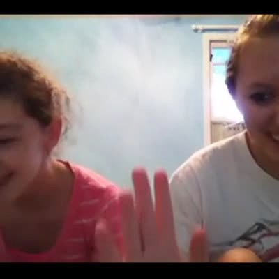 Girls do back flips on a small mattress indoors, practicing gymnastics. One girl tries a front flip and the blanket underneath her gets whipped over her face. The woman behind the camera laughs.